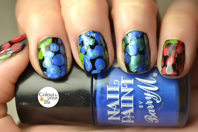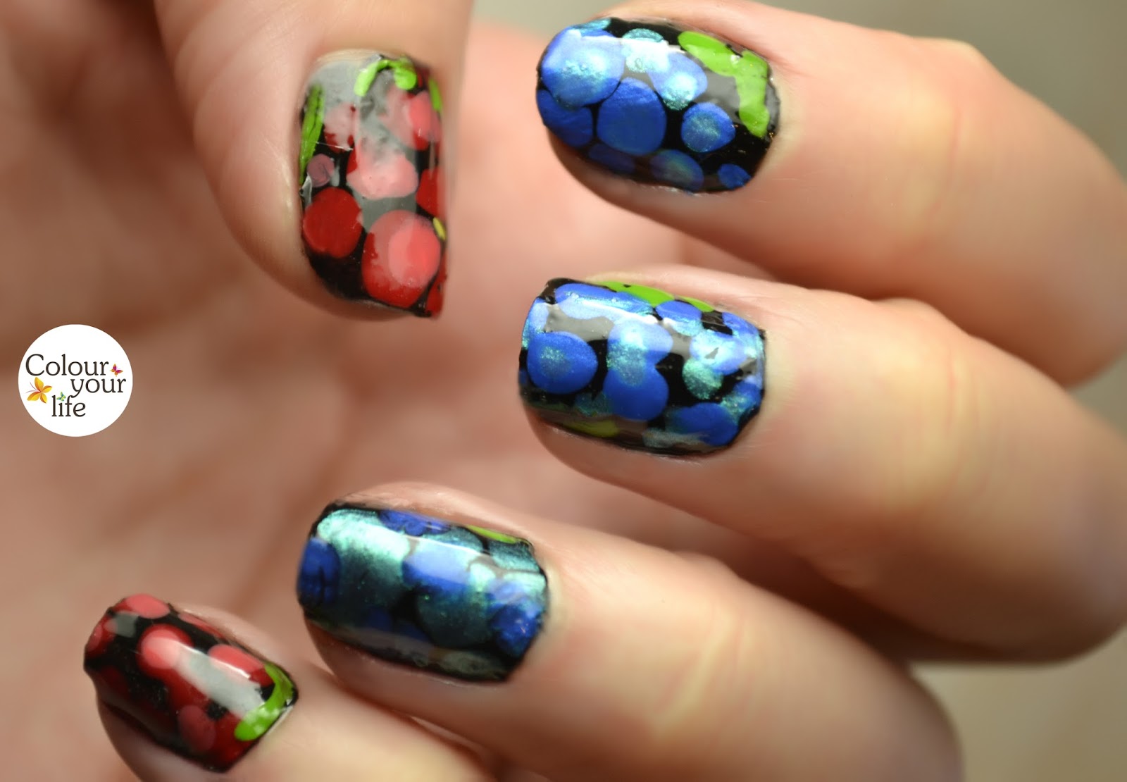 Now, I want to show you my interpretation for the theme Grapes Picking, it is a little bit abstract but this was the perfect time to try to make decals. I used the below seen polishes and painted two layers of black polish on a clear film and I didn't waited until it dried, I add on it a few drops of different shade of blues and red polishes. For the grape leafs I added a little bit of green too. I let them dry and add them on my nails with the help of a tweezer and finished with a clear top coat.