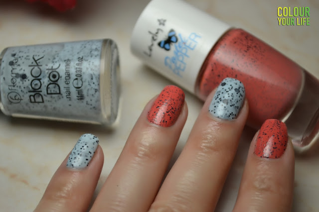 The last two weeks were extremely busy and I didn't wanted to run with naked nails around, so I opted to use two polishes with black glitter particles, Lovely - Pastel Pepper #1 and Flormar Back Dot 05.