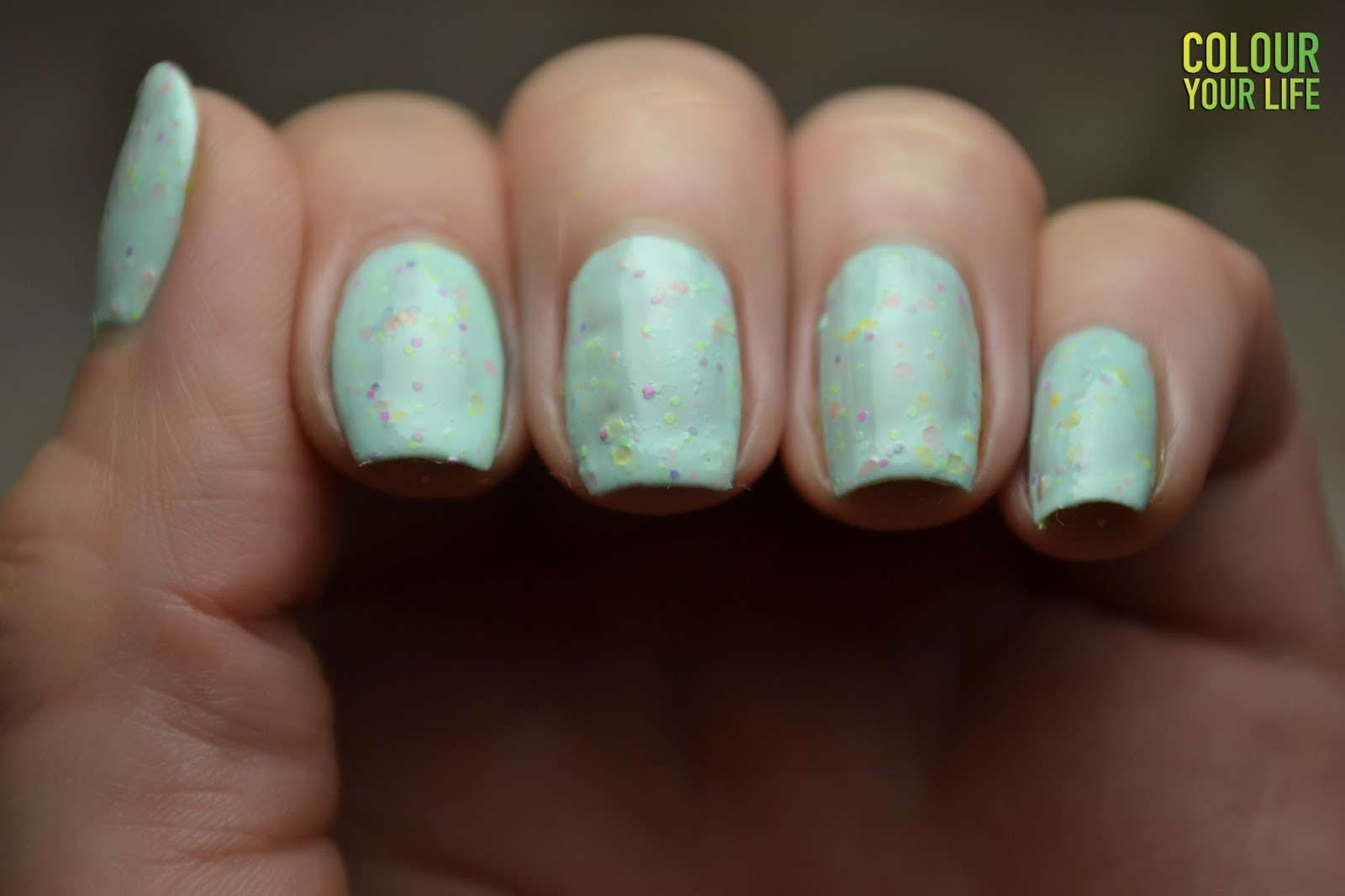 I few words about the quality of this BONI - ice cream shimmering polish. I applied the polish in one coat, because I found it very thick and the glitter particles did not found their places. The problem was that in one coat this polish was very stripy and did not cover as I like, so I tried it with two coats, but unfortunately it was to much and it dried very slowly. The surface of the nails were bumpy and the glitter particles didn't get even. I used a top coat but nothing changed, my nails did not get smooth. I like though how the multi color glitter particles pop against the pastel background!