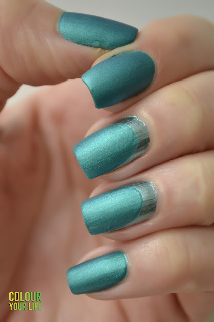 On two of my nails I made a revers french nail art with the help of a chrome nail polish called Aquamarine Chrome by Sally Hansen. I like very much the combination of the shiny chrome effect together with the elegant matte one.