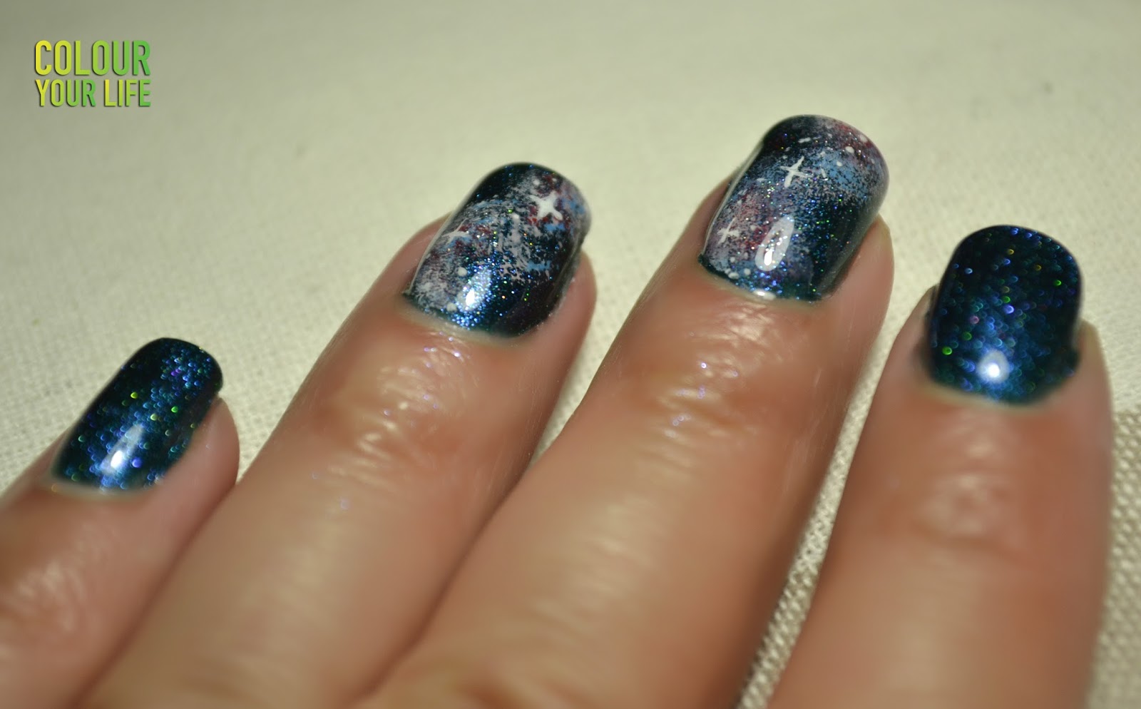 I had to make a nail art and when I first saw this nail polish I already knew that I will make a galaxy mani. I used acrylic paint to achieve the galaxy effect and after it dried competently I applied two coats of clear top coat to seal the image. I didn't made from such a long time galaxy nail art, this is why I enjoyed wearing it a lot and I received many compliments, mostly because the nail polish simply glowed and sparkled in the sun and caught peoples attention :)
