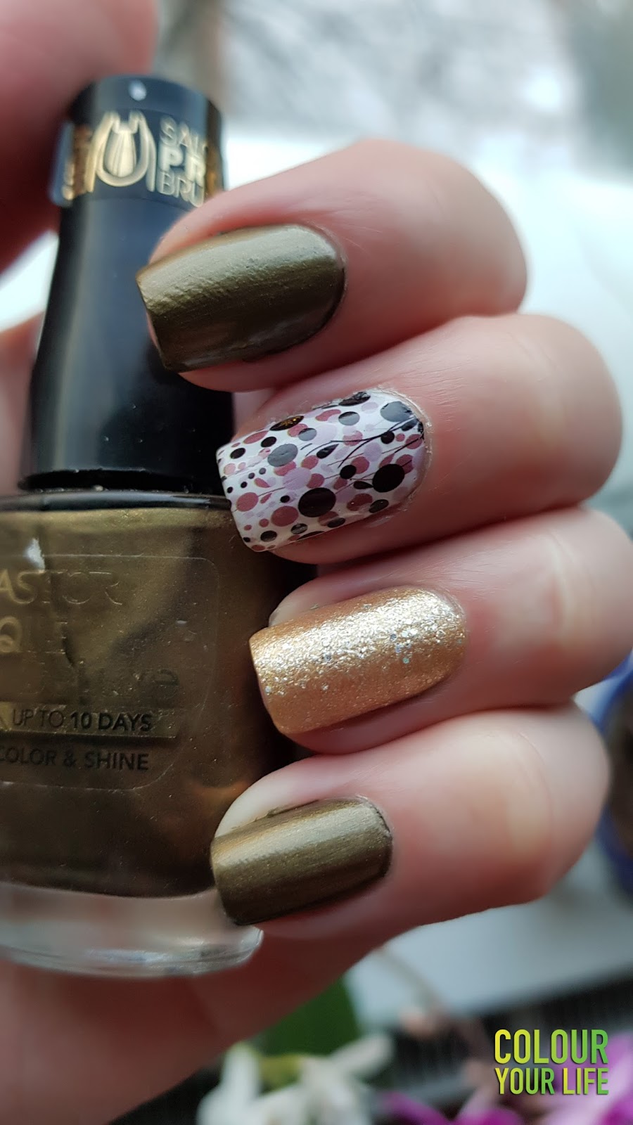 Before I went for a few days to the mountains I made a quick mani because I wanted to protect my nails. You all know when I am in a hurry I use water decals so nothing has changed this time either. I made this mani in no time by using two nail polishes Astor - Golden Green combined with Pupa - Golden dust. Regarding that on that day everything was on fast-forward I made just a few pictures with my phone (sorry for the quality of them) just to show you what I wore. I liked the combo, it's not a perfect match for the colors but in my opinion everything works pretty good together. Don't you think?